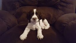 Bella is our baby girl and our fourth Springer Spaniel. She was the puppy we kept from Shelby's and Hunters first litter, born on July 16th, 2018. She is very small and petite and weighs about 30 pounds. So now we just have Shelby and Bella. Trust me when I say that is enough! They play great together and are just like our kids. They are spoiled rotten and are loved so much. They both love it when the grandkids come over because they are just as wild as they are at times. They enjoy running around and especially love chasing after birds. They are very smart and are great dogs. We can't go anywhere without them being right by our side. Can't even go to the restroom alone. No privacy in this house. They are like Velcro, and just stick to you no matter where you go. One minute they may be bouncing around playing and then when they settle down, they are right in your lap. Just like little couch potatoes with us! It's a good thing they are medium sized dogs instead of large because they are definitely lap dogs! They are truly the best breed of dogs out there, but we are biased. We will never own any other breed again.